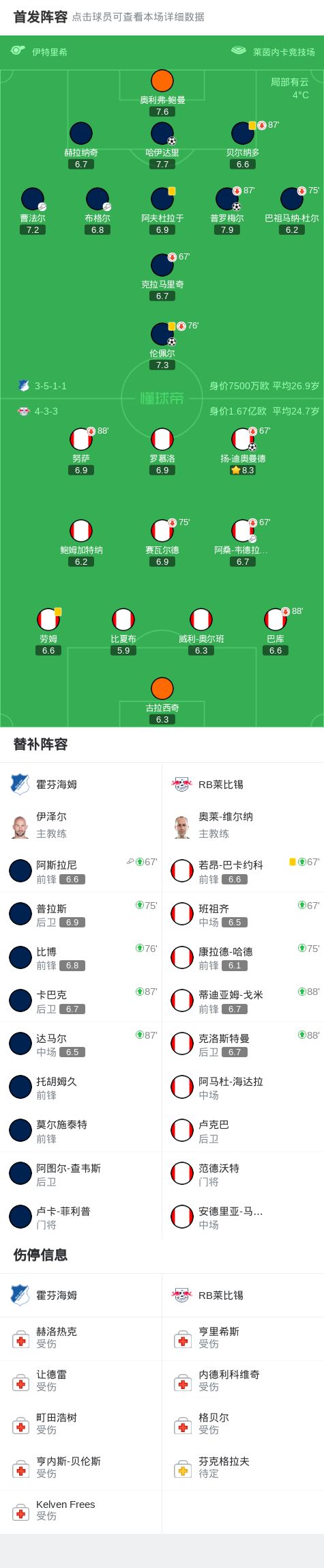 北京时间11月8日,德国足球甲级联赛第10轮展开较量,霍芬海姆坐镇主场迎战RB莱比锡。比赛开局阶段,RB莱比锡率先打破僵局,扬-迪奥曼德接阿桑-韦德拉奥果助攻取得进球。随后霍芬海姆迅速做出回应,哈伊达里在布格尔的助攻下扳平比分。第38分钟,曹法尔送出精准传球,伦佩尔冷静施射建功,帮助主队实现反超。进入下半场,霍芬海姆持续施压,第79分钟,阿斯拉尼助攻普罗梅尔破门,进一步扩大领先优势。最终全场比赛结束,霍芬海姆以3比1战胜RB莱比锡。