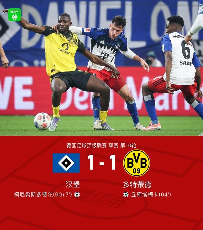 北京时间11月8日,2025-2026赛季德国足球甲级联赛第10轮,汉堡坐镇主场迎战多特蒙德。下半场施洛特贝克倒钩助攻,丘库埃梅卡破门,最后时刻柯尼希斯多费尔头球绝平。最终多特1-1战平汉堡。