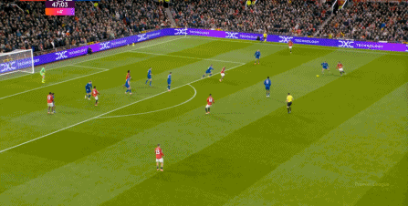 这里存在的一个变量,是此前的界外球进攻当中,埃弗顿的双中卫都来到了前场,所以在埃弗顿把球送回后场运转的时候,曼联的前场球员先是没有进行逼抢,随后在基恩后撤的时候,卡塞米罗随之移动,从而露出了他和布鲁诺之间,可以联系到霍尔的线路: