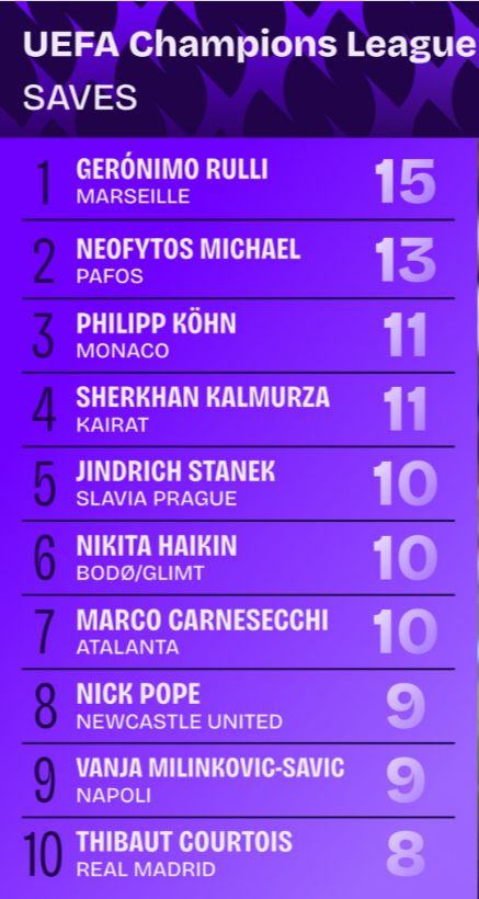 雷速体育10月2日讯 本赛季欧冠联赛阶段已战罢2轮,相关数据机构统计了本赛季欧冠截止目前的门将扑救次数榜。马赛门将鲁利以15次扑救独自领跑,纽卡门将波普和那不勒斯门将萨维奇并列第8,皇马门将库尔图瓦8次扑救排名第10。