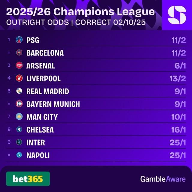 欧冠联赛阶段2轮战罢,目前拜仁、皇马、巴黎圣日耳曼、国际米兰、阿森纳、卡拉巴赫6支球队保持全胜。最新夺冠赔率榜上,卫冕冠军巴黎与刚刚成为自己手下败将的巴萨同为6.5,领跑群雄,其后是阿森纳7、利物浦7.5、皇马10、拜仁10、曼城11、切尔西17。 不过,OPTA的测算结果与赔率不同:巴黎和巴萨都要靠后站,夺冠概率最高的是阿森纳,达到18.1%,其后是利物浦14.7%、巴黎14%、曼城9.7%、拜仁9.5%、巴萨8.3%、皇马4.9%。